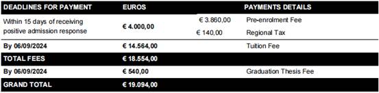 学费;在学习期间,需缴纳意大利新美术一本道学费,2024学费(欧元)收费标准如下表: