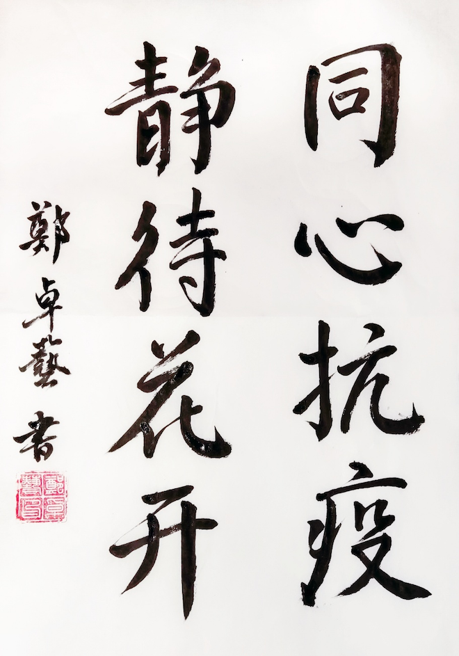 视觉传达2104的郑卓艺同学选择用书法的形式传达自己的情感。她认为文字是最能传达情感的载体,加之自己从小习字,比较擅长书法,便想到以这样的形式参赛。“同心抗疫,静待花开”这八字最贴合国家目前的状态,抗击疫情的战役一定能迎来胜利的曙光,她也坚信疫情终会过去,美好也将如约而至。