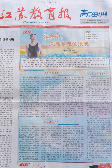 宋婉宁同学先进事迹被《江苏教育报》重点报道。报道以《采撷梦想的浪花》为题,从“青春、成长、生命”三个维度讲述了宋婉宁以勤奋与执着为底色的奋斗故事。