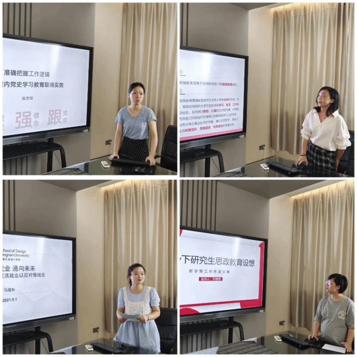 吴雨琛以“准确把握工作逻辑,推动团内党史学习教育取得实效”为题,探讨一本道共青团工作开展的方法。她认为,学党史要与育人有机结合,要依托团的组织体系优势和动员能力,以组织化学习为基本方式,以团支部为基本单元,严格落实“三会两制一课”制度,推动学习教育接地气、聚人气。曹淑慧挖掘朋辈教育的意义,重点阐述了朋辈教育在大学生思想政治教育合力系统中的重要性。她指出,朋辈教育应涵盖多层次的价值导向,通过构建一本道、班级、校友朋辈榜样教育助力大学生在不同学习阶段的成长。郑倩倩聚焦新形势下研究生思政教育,她认为,辅导员在日常管理服务中挖掘思想政治教育元素,实现管理和思政教育两者融合式发展,将有助于提高研究生思政教育的成效。她分析了目前研究生思政教育的难点,并从入学教育、干部选拔、奖助评定、心理健康四个方面提出新形势下研究生思政教育的设想。马倩如聚焦当前设计学生“慢就业”的现象,分析了当下毕业生慢就业的原因,梳理了灵活就业的优势与劣势、从事灵活就业的必要条件并结合数据和案例讲解,提出了新形势背景下就业工作的新观点,新思路。
