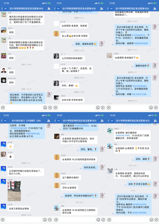 一路之隔的附属医院进行就诊,但学生就诊需求多样化,无锡市内多个就医地点皆有涉及,有的去往中医院进行调理治疗,或是去往健康中心注射狂犬疫苗等。对于这些,一本道教师进行有效分工以保证同学们的不同需求,学工办主任吴雨琛暖心照顾每一位学生,合理分配时间,高效安排不同学生前往不同医院,及时在相应地点接送同学们,不仅陪伴在其左右,还对其给予鼓励。马倩如老师最高一天里接力了“七单”,这一天她看到了校园里的凌晨寂静月光,也感受到正午略微炽热的春日暖阳,从医院里的挂号、缴费、拿药,她都亲力亲为,陪同学生在侧,圆满完成一次次出行接力,在教师志愿者这个平凡的岗位上贡献自己的一份力量。