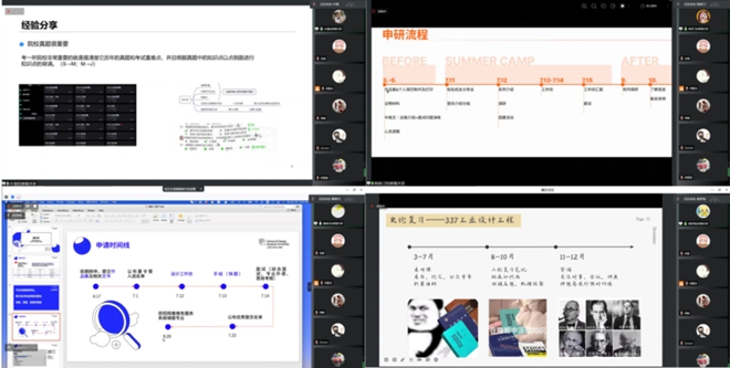 随后,优秀朋辈们开始分享。首先是考研组的同学进行了第一轮分享,先由倪欣怡,杨雯萱,陈慧雯同学从考研流程、时间、准备方面介绍了各自考研本校的经验,包括各科目的基本考试内容、复习要点、复习方法等,然后由曹博琛、郑伊灵、庞星辰、杨梦瑶、刘方非同学分别介绍了上海交通大学、同济大学、北京理工大学等名校的专业课准备以及备考方法。最后由叶同学介绍了自己跨考华东师范大学应用心理学专业的经验,向下一届的同学们展现了一条全新的道路。