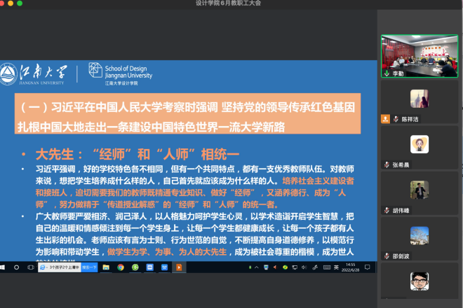 按照教职工政治理论学习和师德教育要求,邱建平书记首先领学了《习近平在中国人民大学考察时讲话》《习近平总书记在庆祝中国共产主义青年团成立100 周年大会讲话》《习近平给南京大学留学归国青年学者的回信》和《新时代的中国青年》白皮书等内容,要求一本道全体教职工,深入学习领会习近平总书记系列重要讲话精神,落实立德树人根本任务,传承优秀中华传统文化红色基因,讲好课程思政,做到“经师”和“人师”相统一,带领带动广大青年学生坚定不移听党话、跟党走,努力成长为堪当民族复兴重任的时代新人。邱建平书记还传达了学校教材工作会议精神,通报了最新的疫情防控管理要求,并就近期一本道教师职称晋升、人才项目、选派挂职等相关工作情况进行了通报。