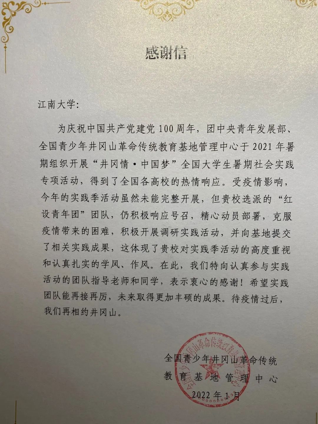 2021年实践团队围绕井冈山历史,将井冈山革命斗争历史分为创立、巩固发展和坚持斗争三个阶段,并以其作为切入点,以手绘的方式绘制相应的重大历史事件,并做成动画视频和周边文创产品。在视频创作中加入了历史教育体验,期望以体验来促进教育;在产品设计中加入红色能量与传承的体验,增强红色精神资源产品的创新性和吸引力,创造易传播的文创周边产品。受疫情疫情影响未能至井冈山实地实践,线上开展后收到全国青少年井冈山革命传统教育基地管理中心感谢信。