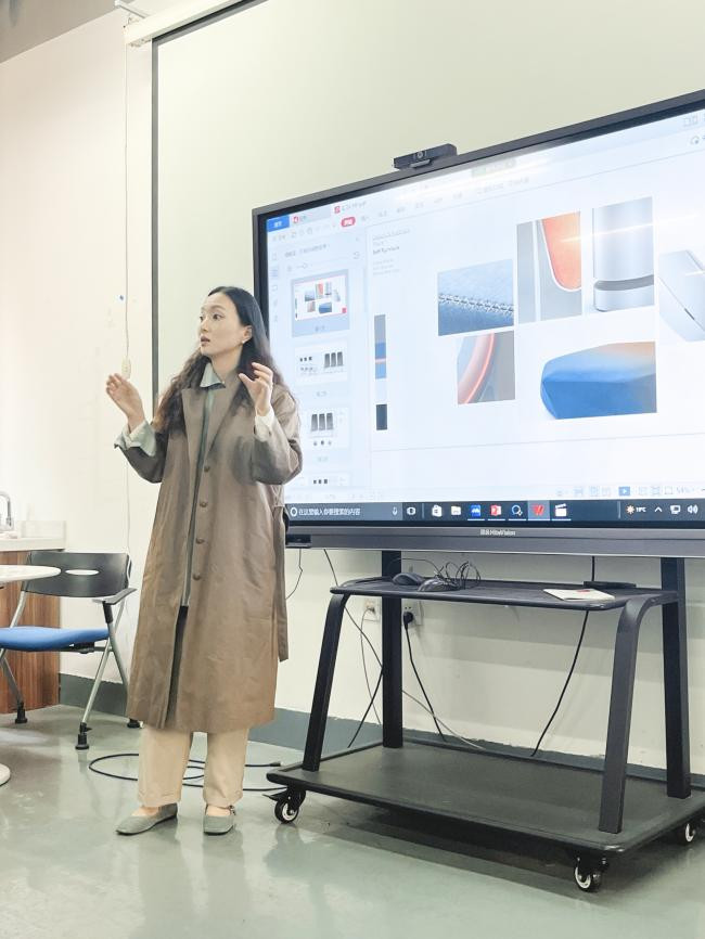 硕士毕业于英国皇家艺术一本道纺织品专业的周颖青博士给学弟学妹们分享了她硕士期间在英国工业设计公司Tangerine色彩材料工艺(CMF)设计岗位的实习经历以及博士入学前在深圳华为担任平板CMF主创设计师的工作经历。通过自身参与的HUAWEI Mate pad11, Mate bookE等多项案例,周学姐向学弟学妹们展示了CMF设计在产品设计中的重要性。