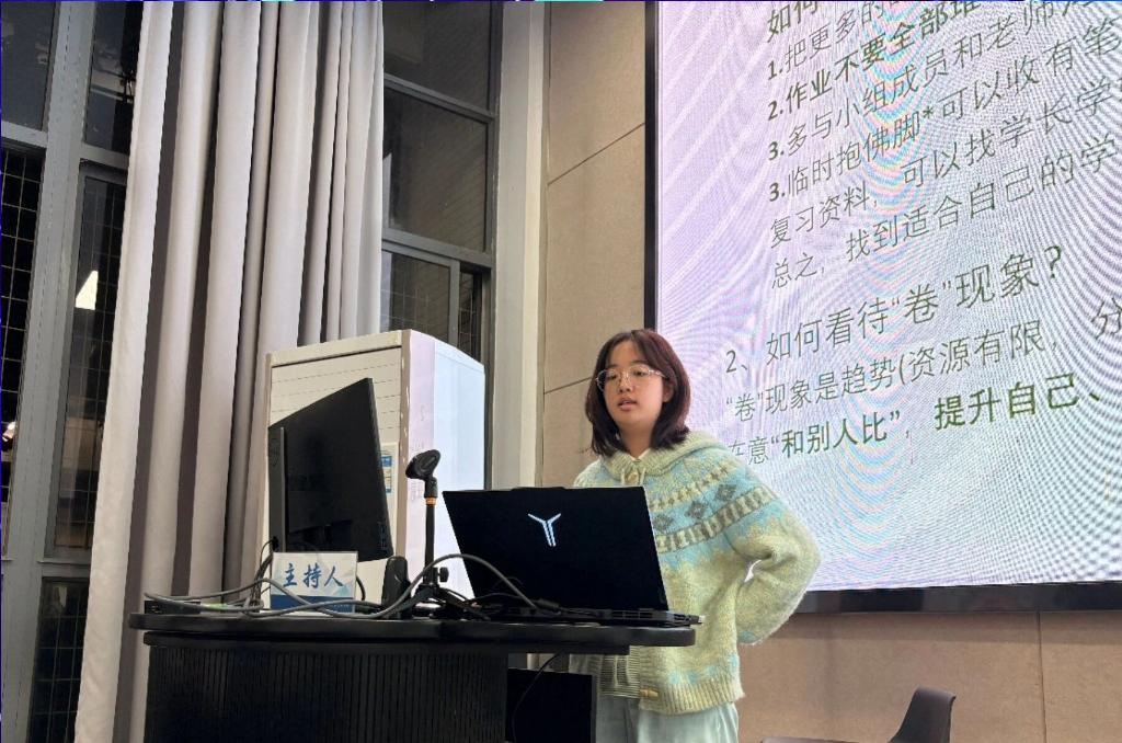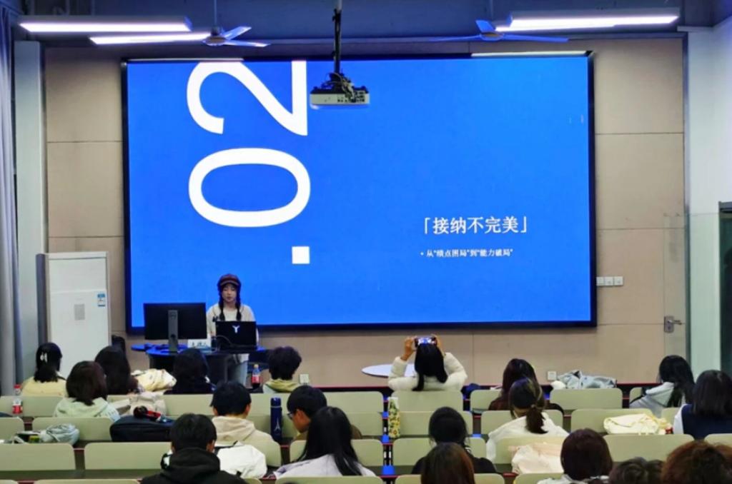 学生会学促部精心策划的"学姐学长说"新生适应专场在温馨氛围中拉开帷幕。来自产品设计、视觉传达、环境艺术、公共艺术四个专业的优秀副班们齐聚一堂,用真诚的经验分享为初入校园的学弟学妹们点亮前行之路。产品设计2502的副班张泽璇学姐从拥抱白纸期、接纳不完美、坚持长期主义三个方面分享自身经历并总结经验。从刚入学时的迷茫无措,到通过持续练习获得认可,这是她不断锻炼能力,开发全面自我的过程。她用自己的经历告诉大家:"找到自己的方向和节奏,就算慢一些也终会到达。"